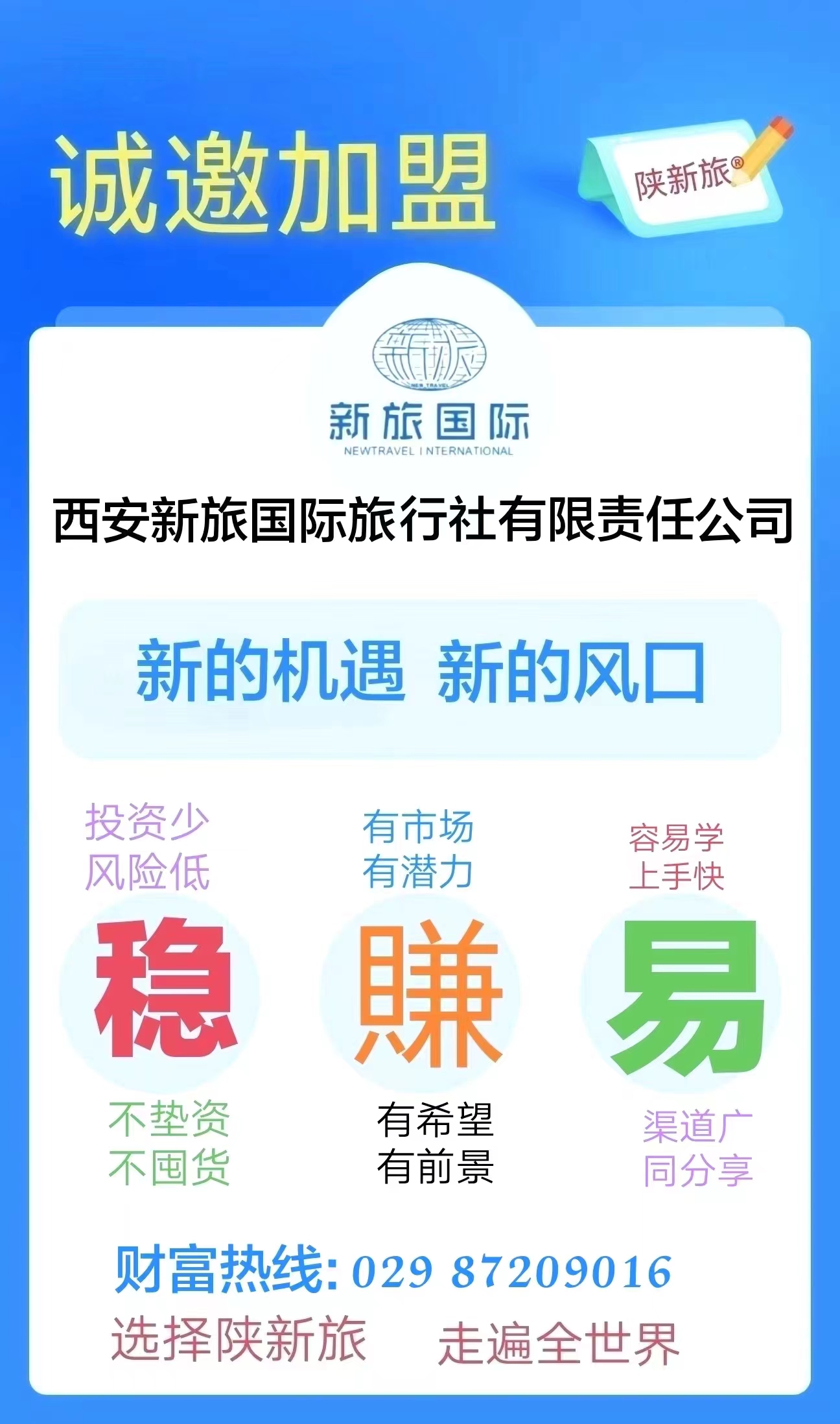 歡迎各地的有識(shí)之士能加盟到我們團(tuán)隊(duì)中來,資源共享、共謀發(fā)展!為旅行創(chuàng)造精彩,讓游客感動(dòng)生活;選擇陜新旅,走遍全世界!