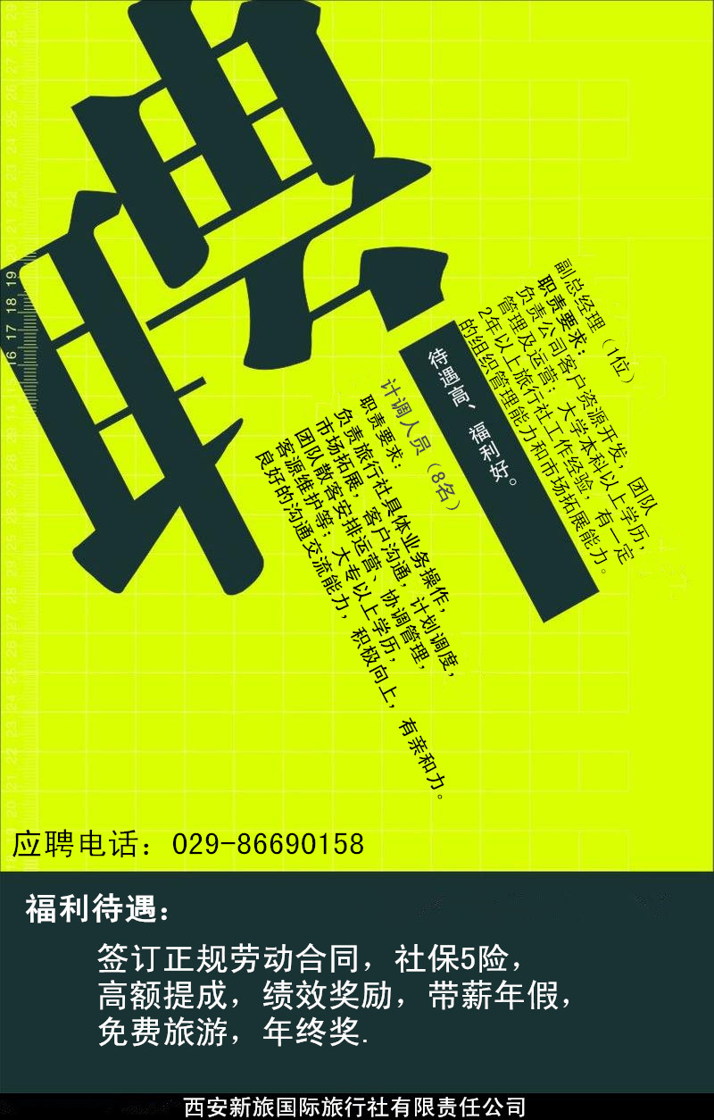任職要求:旅游相關(guān)專(zhuān)業(yè)大學(xué)本科或以上學(xué)歷,旅游行業(yè)2--3年工作經(jīng)驗(yàn),有一定的組織管理能力,市場(chǎng)拓展能力,抗壓能力強(qiáng);性別不限,25-35周歲。