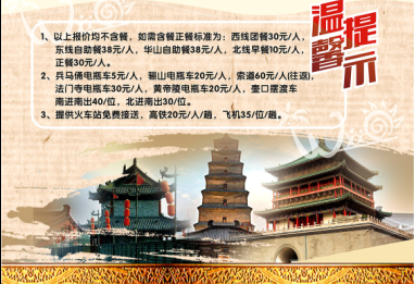10、立足西安,服務(wù)全國。西安新旅國際旅行社位于西安市中心,本公司憑著良好的信譽(yù)、形象、務(wù)實(shí)的工作作風(fēng)和靈活的經(jīng)營方式,在競爭激烈的旅游市場中逐步發(fā)展,健康成長,并具有自身經(jīng)營的特色。同樣的價(jià)格比質(zhì)量;同樣的質(zhì)量比價(jià)格。打造最全旅游產(chǎn)品銷售商,讓游客一站式采購使我們的發(fā)展思路。公司遵循:以質(zhì)量求生存、以創(chuàng)新求發(fā)展、以市場為導(dǎo)向、以服務(wù)為宗旨的經(jīng)營理念,愿為游客提供全方位、多元化、高層次的服務(wù);愿和各界同仁精誠合作,共創(chuàng)美好!